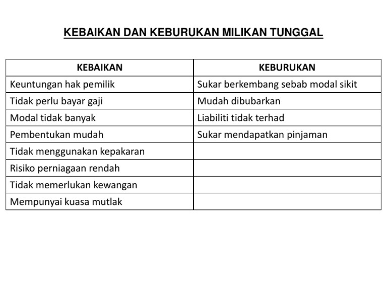Related : Kelebihan Perniagaan Milikan Tunggal / Di samping kelebihan di atas, kita tidak boleh mengabaikan kelemahan yang berkaitan dengan bentuk aktiviti ini..