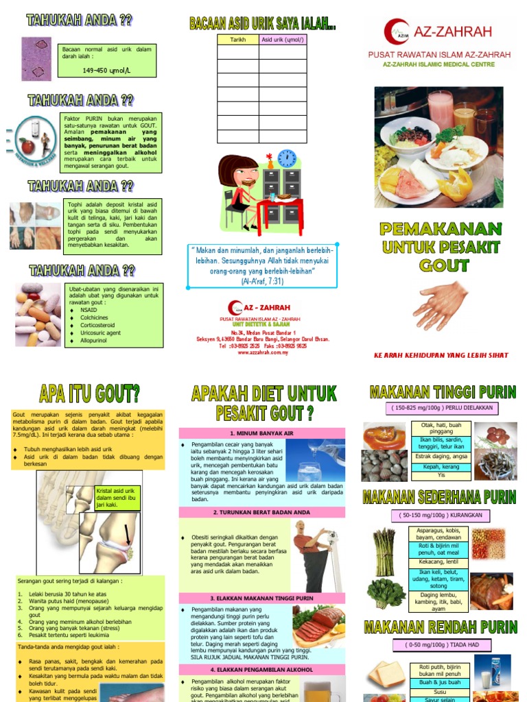 Sekarang dah tek kena gout. Mengelakkan asid urik berkumpul dalam badan. Purin dijumpai sangat tinggi kandungannya dalam. Gout terjadi apabila kandungan asid urik dalam darah meningkat (melebihi 7.5mg/dl). Mengeluarkan asid urik dengan berkesan. Gout jika tidak dirawat boleh menyerang buah pinggang dan terbentuknya batu karang! Tingginya asid urik dalam darah boleh membawa kepada pelbagai jenis penyakit. Mengelakkan asid urik berkumpul dalam badan. Produk kami berjaya membantu ramai penghidap gout untuk hidup lebih normal. Gout ni rasanya seperti kesakitan yang amat sangat di bahagian sendi. Asid urik terbentuk apabila purin dipecah dalam badan. Asid urik yang tinggi boleh menyebabkan gout iaitu gout : Purines berasal dari makanan tertentu seperti daging organ, asparagus, bayam, lentil, bir atau wain serta dari pecahan protein di dalam badan.