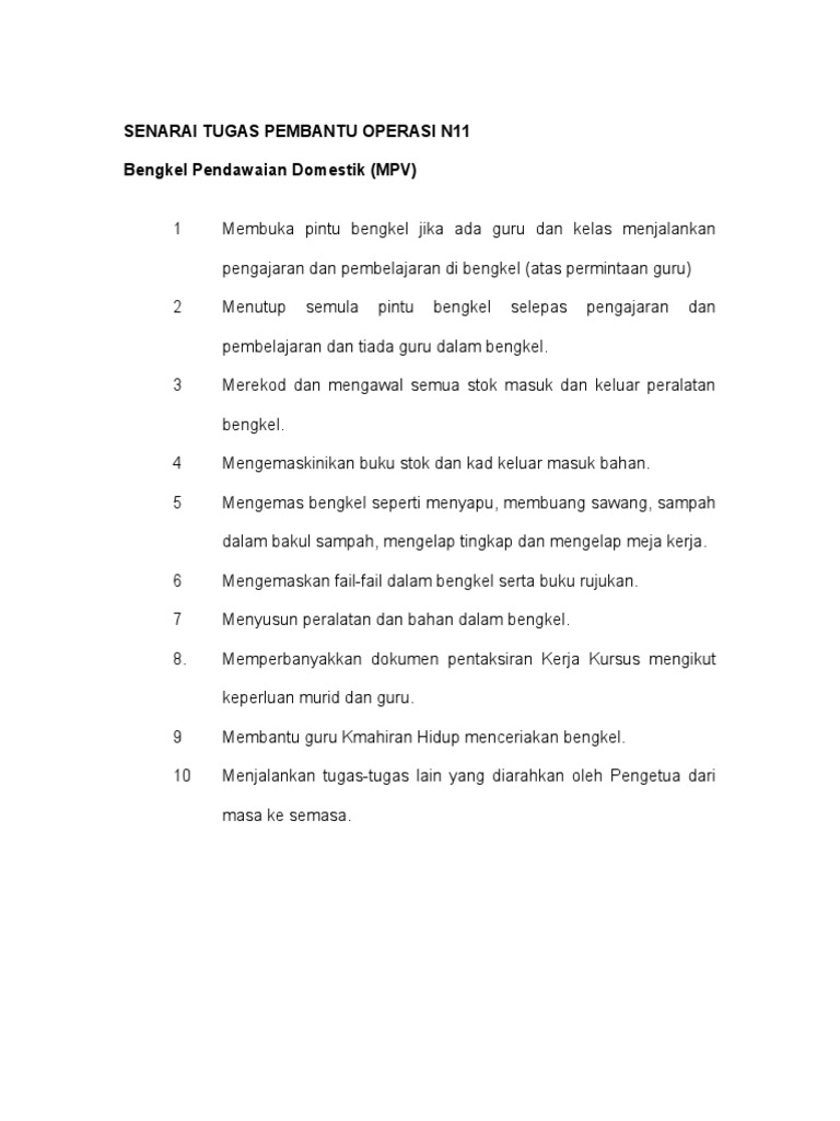 Senarai Tugas Pembantu Operasi N11 Di Pejabat from lh3.googleusercontent.com Senarai tugas pembantu operasi n11. 1 my portfolio pembantu operasi structure analysis studocu. Senarai tugas pembantu operasi n11 di sekolah. Atau (d) (ii) pmr atau kelayakan yang diiktiraf setaraf dengannya oleh kerajaan dan memiliki lesen memandu kelas b2/b/d/e2/e1/e yang dikeluarkan oleh jabatan pengangkutan jalan [kecuali lesen memandu dalam. Kamis, 11 februari 2021 tambah komentar edit. There are currently 6138 movies on our website. Senarai tugas pembantu tadbir perkeranian / operasi n17. Senarai tugas pembantu operasi n11 :